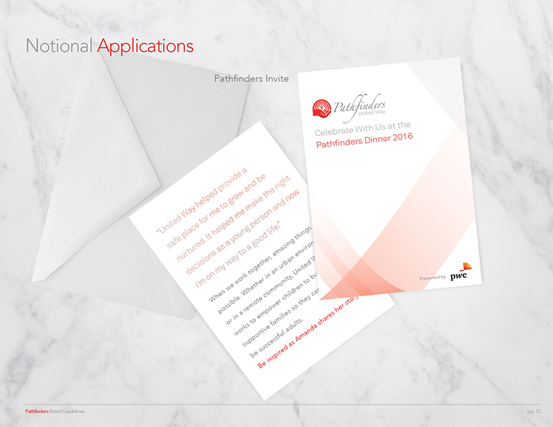 In 2018 we worked with United Way in creating a new sub-brand for their Pathfinders Program. The program was created to shed light on individuals who are helping to change the lives of vulnerable people in our communities. We created a visual identity along with a variety of assets for their annual fundraising dinner.